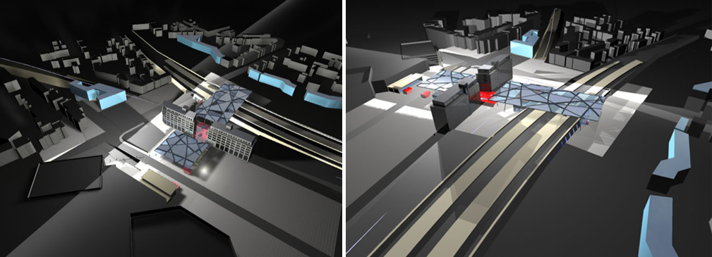 Bahngleisen nachempfunden . Punktuell wurden rote Kuben als